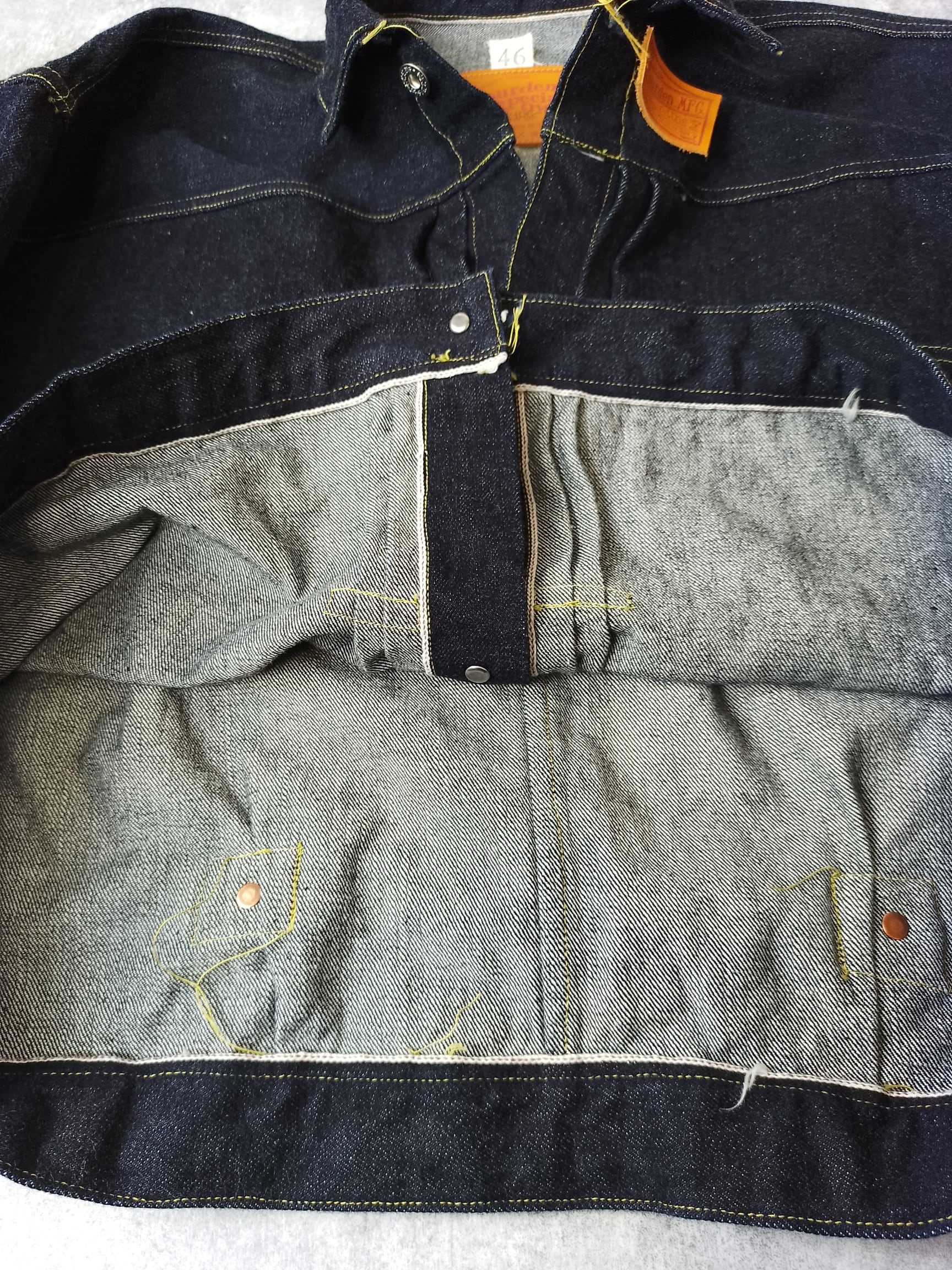 こちらのデニムジャケットの特徴は1940年代の第二次世界大戦モデルをモチーフに製作されていますが、チェーンステッチや巻き縫い用のミシンなどは一切使用せず、家庭用のミシンのみ(一本針のオールシングルステッチ)で縫い上げられている唯一無二なジーンズとなっております。